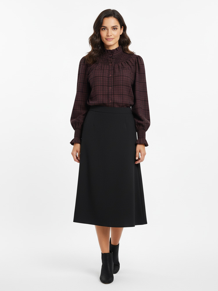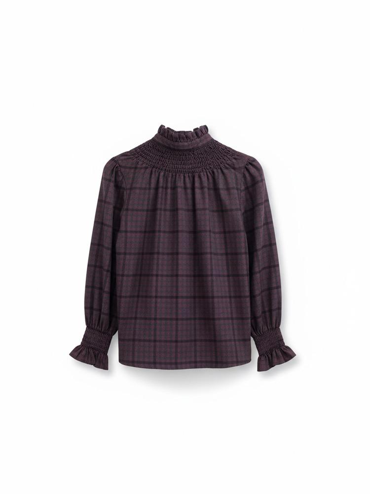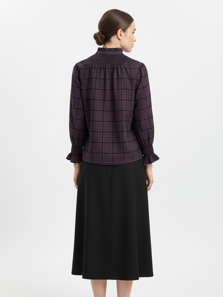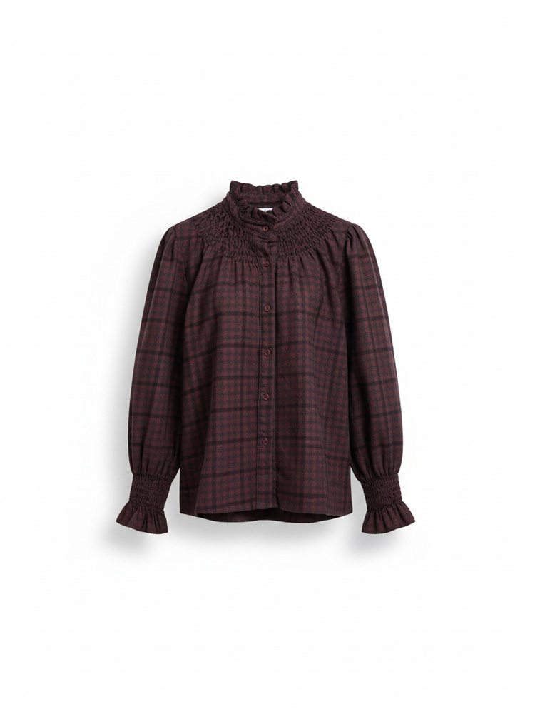 Camisa romántica de cuadros en tono vino, combinado con grises y negro, perfecta para darle un toque sofisticado a tu outfit.