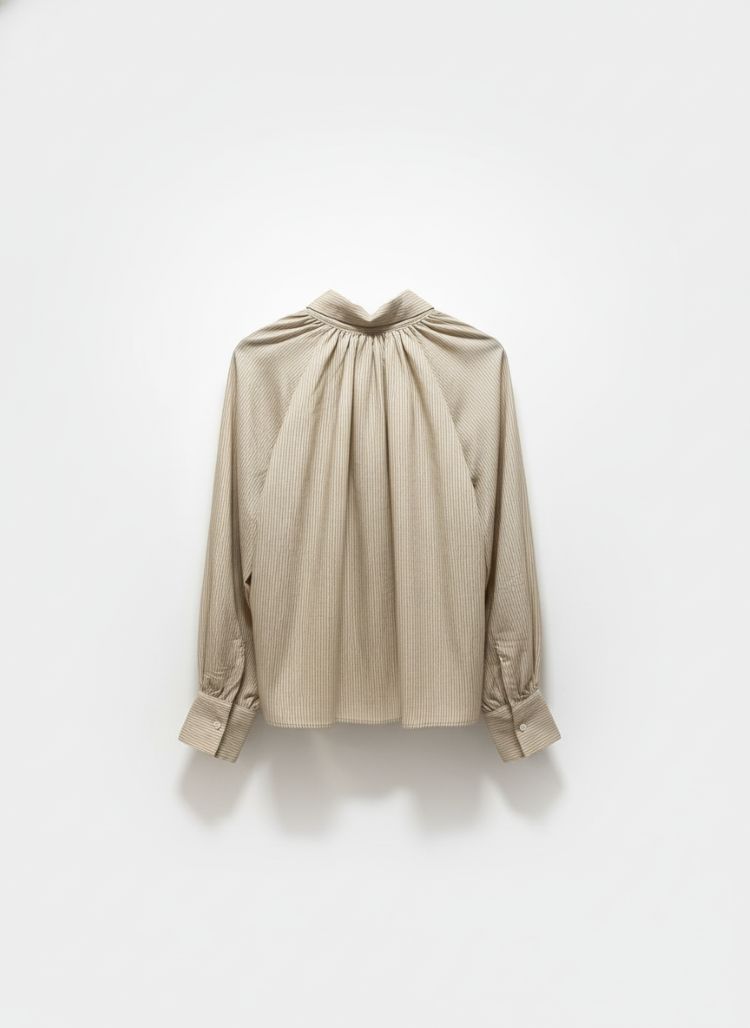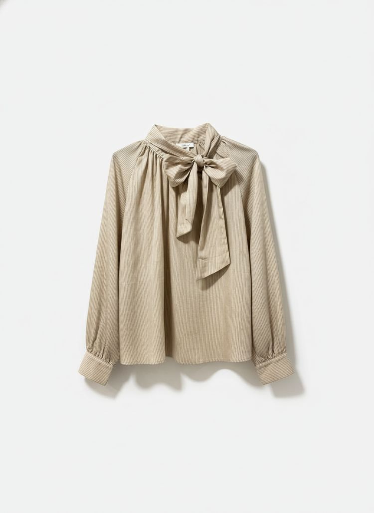 Camisa beige con finas rayas en tono oscuro. El lazo lateral en el cuello introduce un gesto femenino y distintivo, sin perder sencillez.