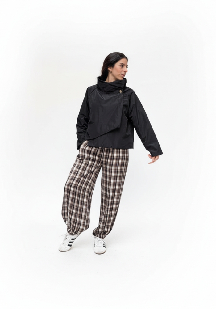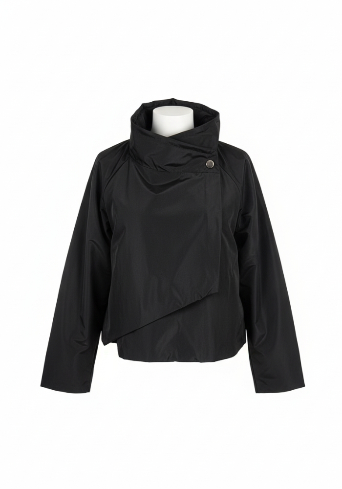 Chaqueta Adela en versión corta, con cuello alto abotonado al lateral y diseño asimétrico.