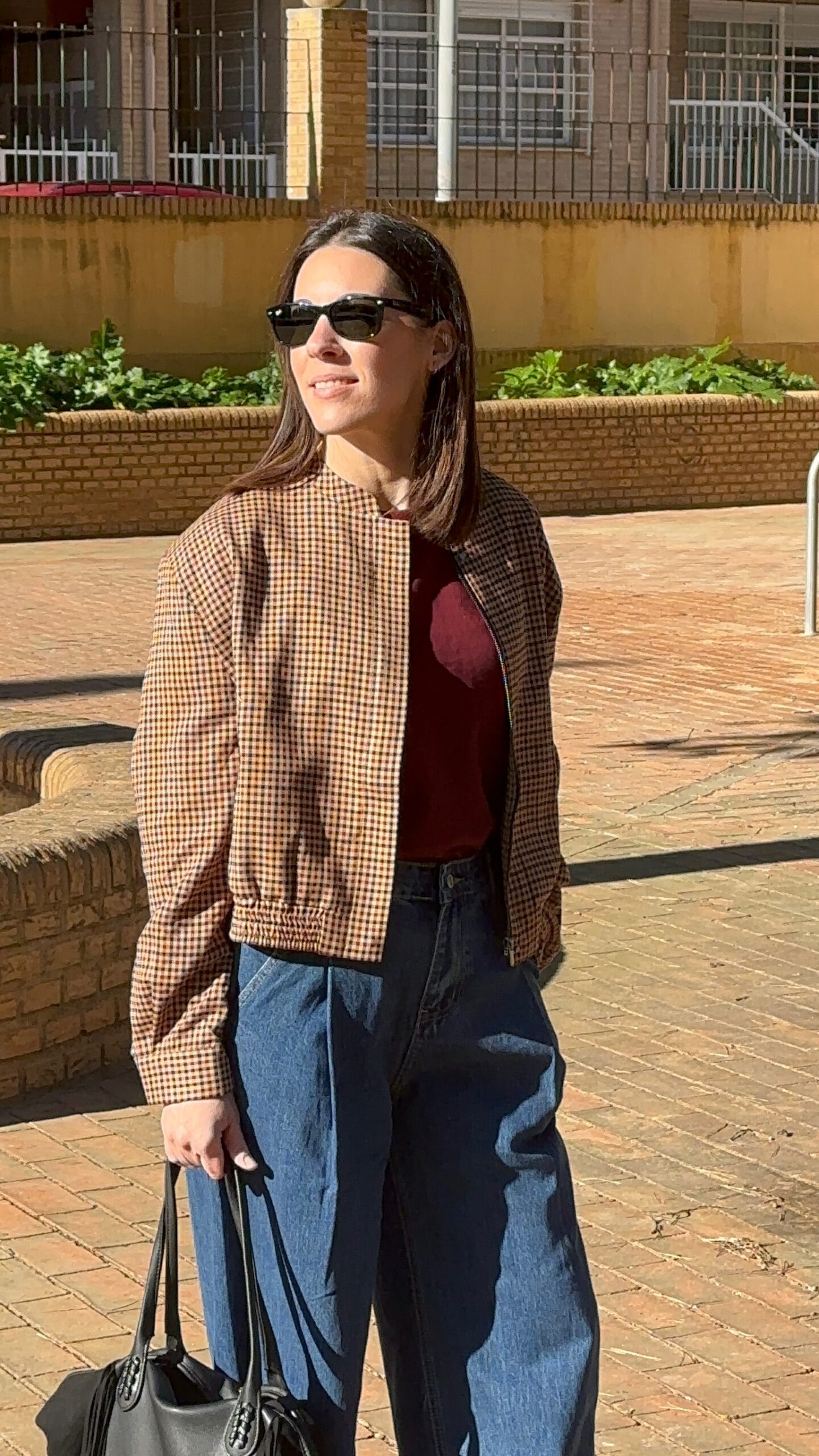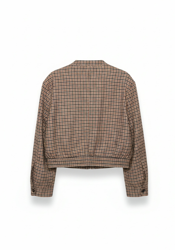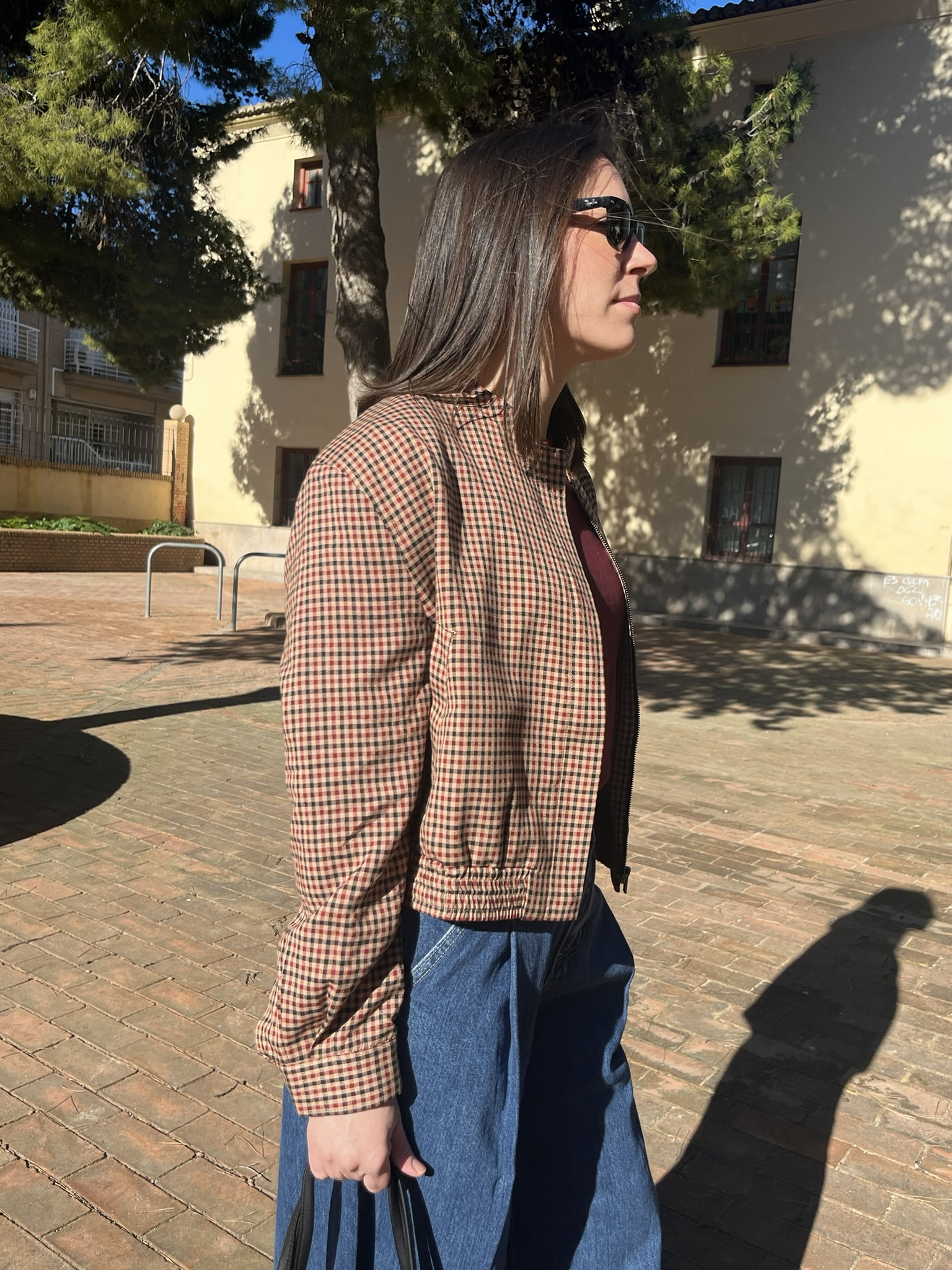 Chaqueta corta de cuadros, con corte relajado y un ligero volumen que aporta movimiento.