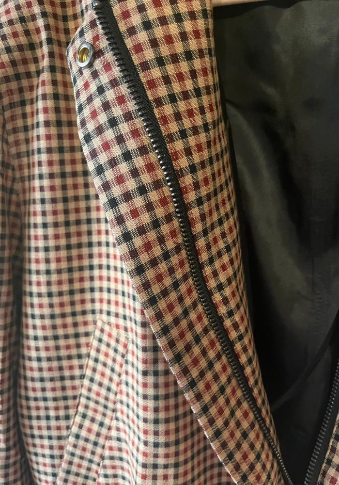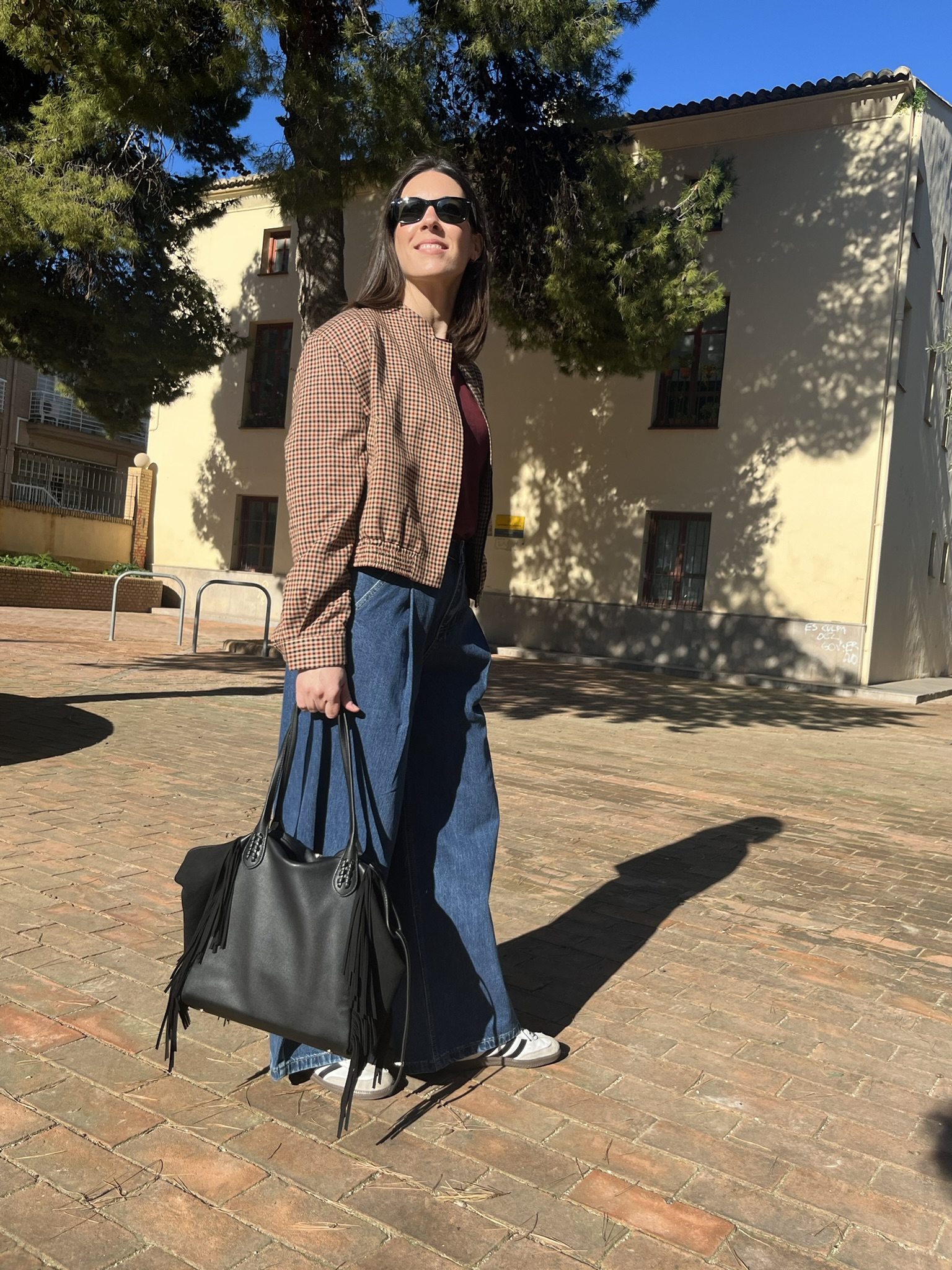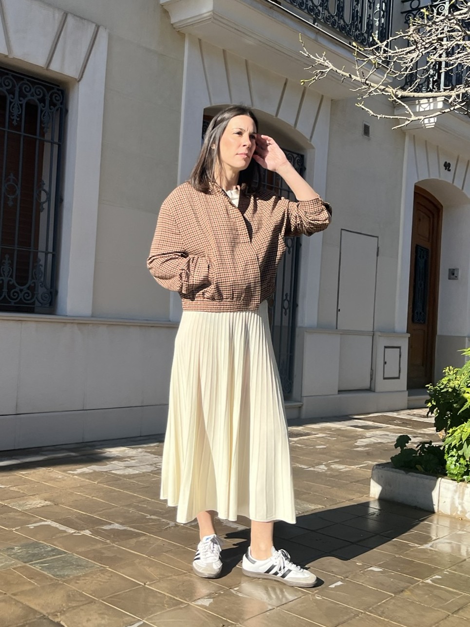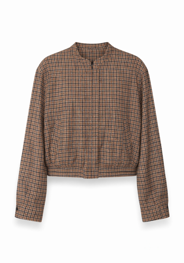 Chaqueta corta de cuadros, con corte relajado y un ligero volumen que aporta movimiento.