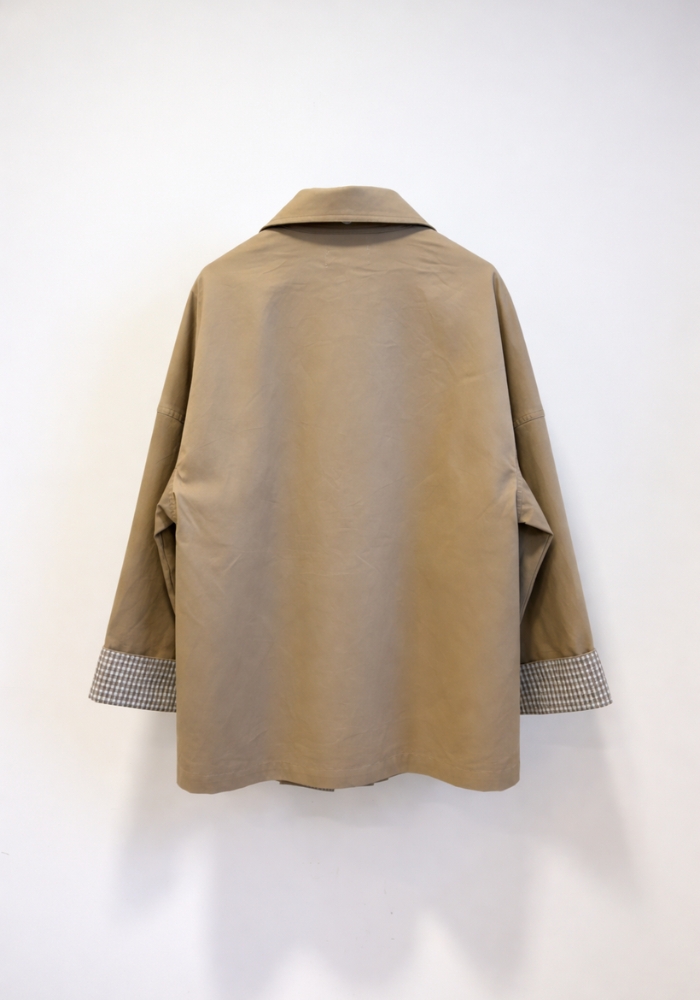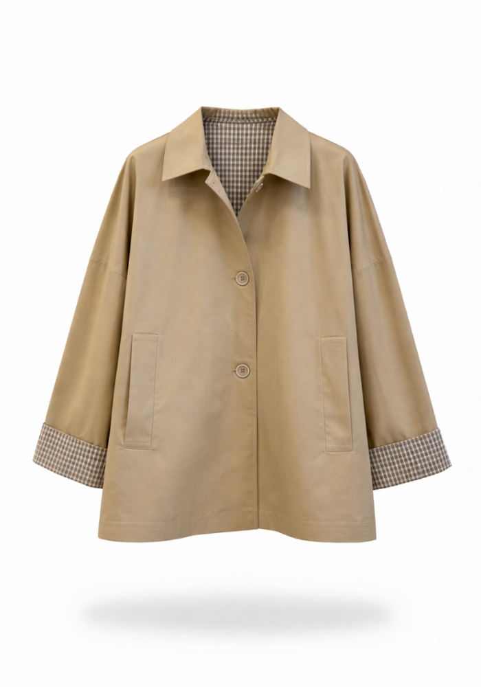 Chaqueta de entretiempo en tono camel, con corte relajado y detalles interiores a contraste.