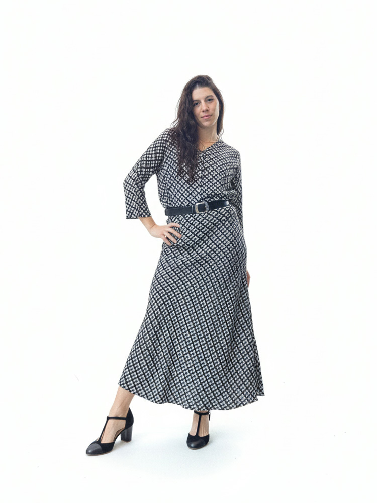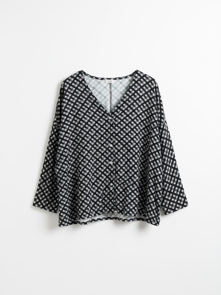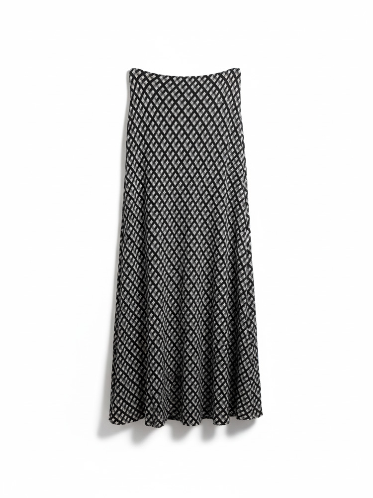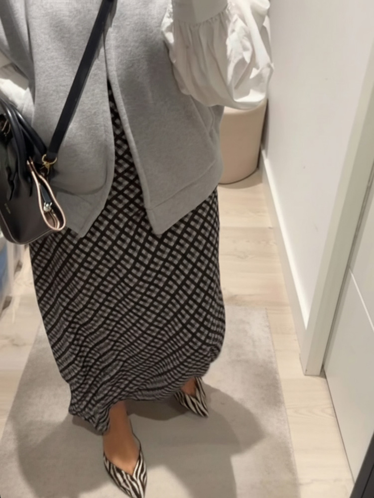 Conjunto camisa y falda de tejido fluido a cuadros grises y blanco roto.