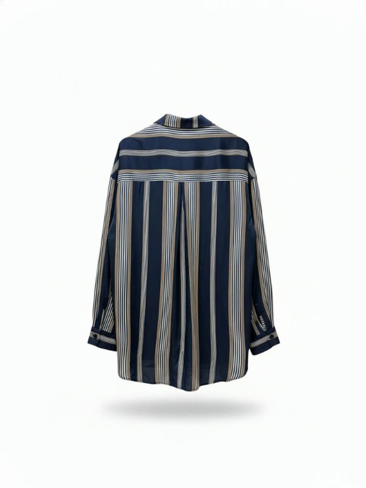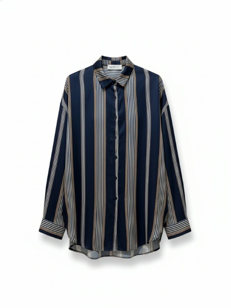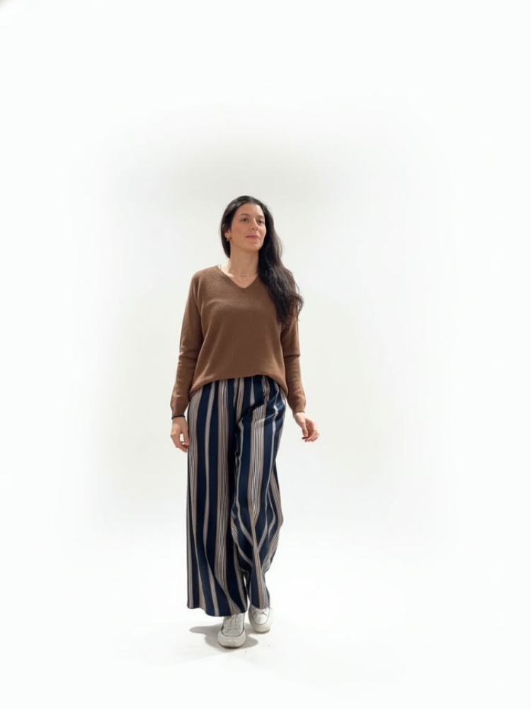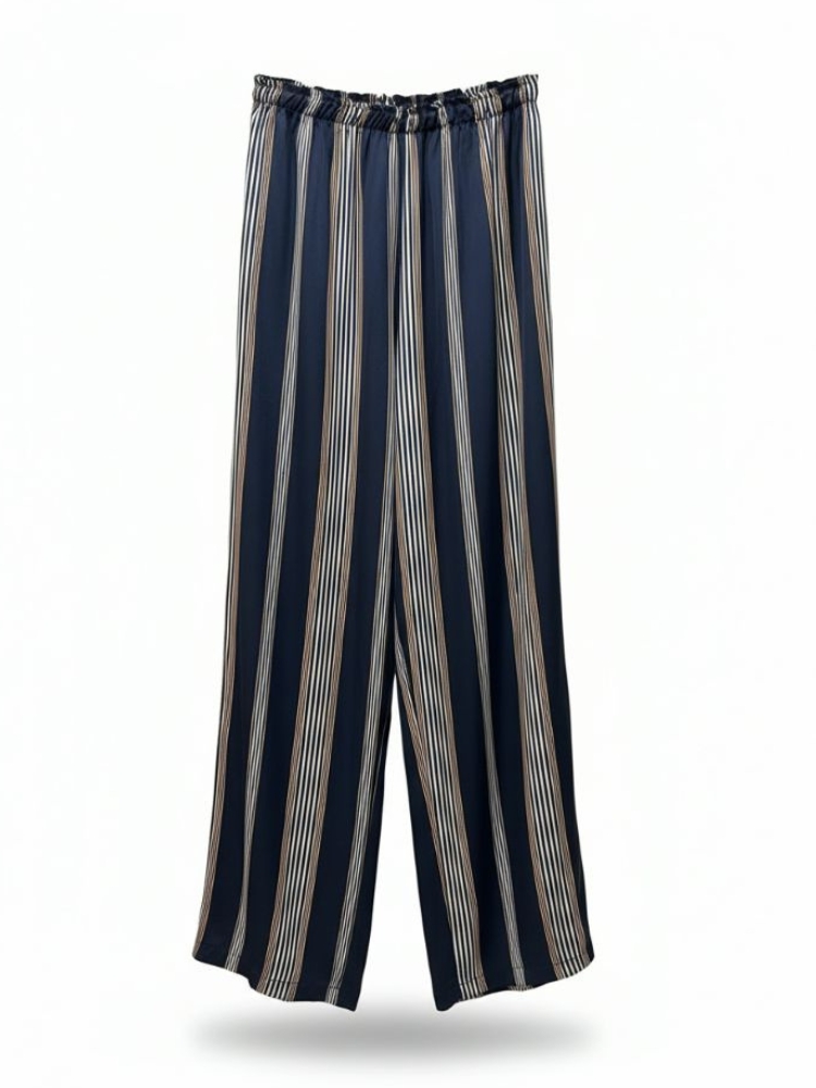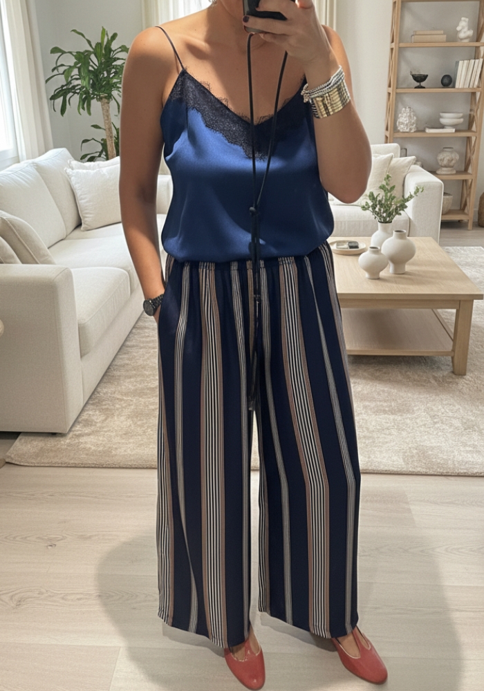 Conjunto azul noche con rayas blancas y marrones, de estilo fluido y relajado.