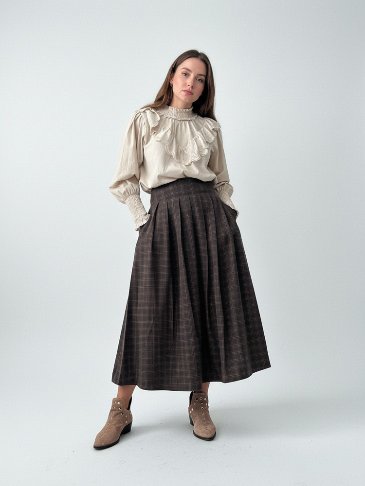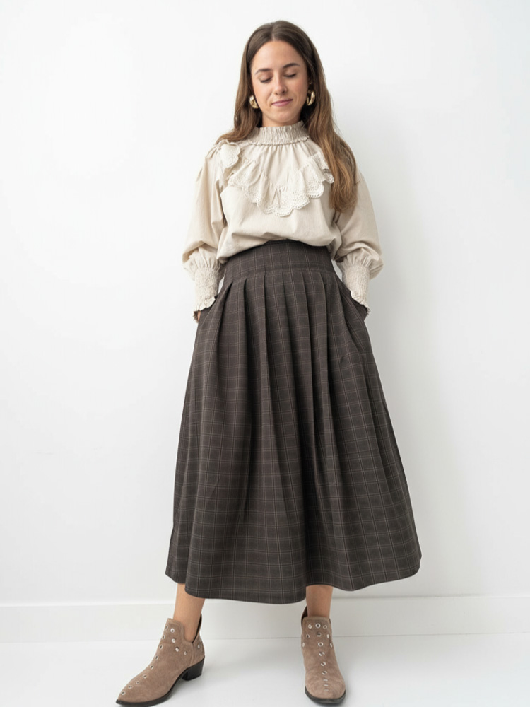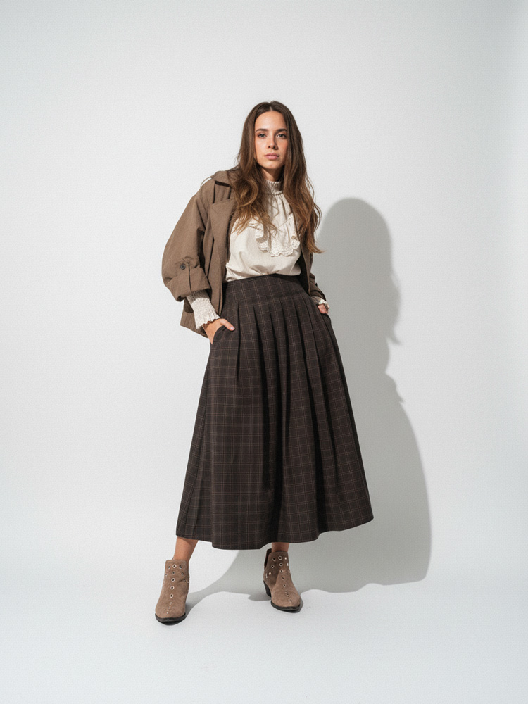 Falda de tablas con estampado de cuadros verdes y marrones. Super tendencia este otoño.