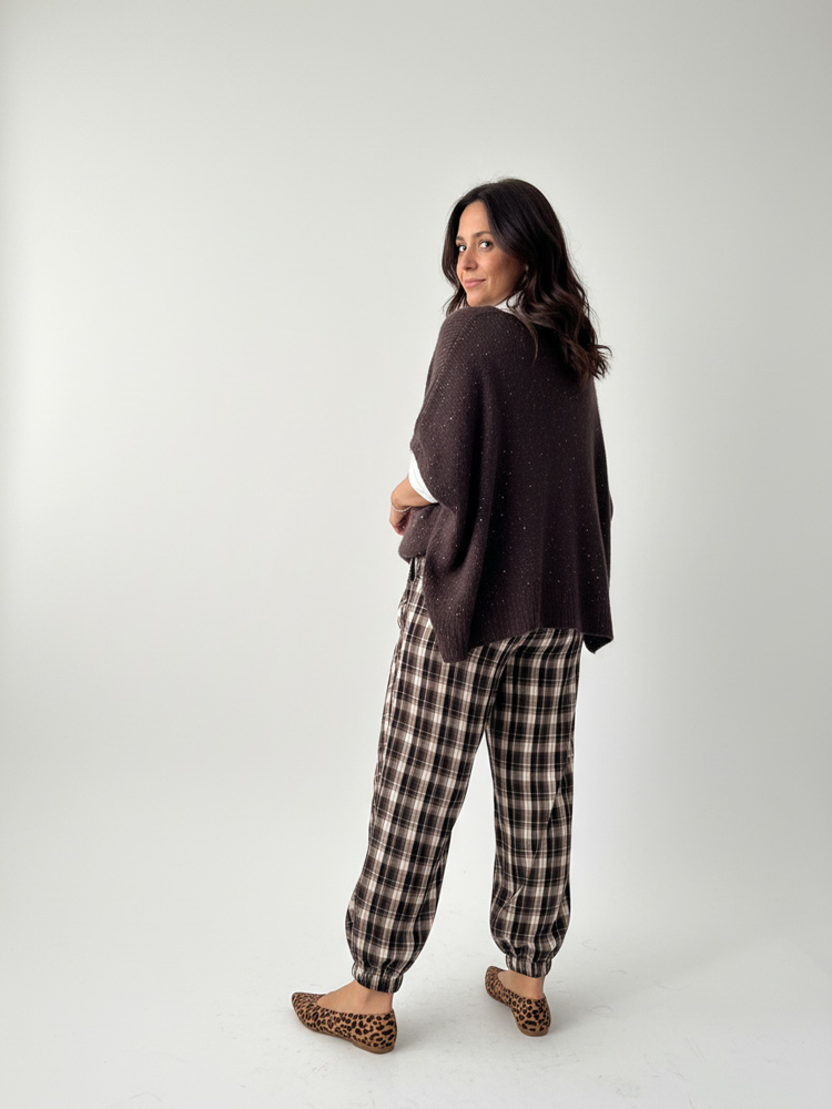 Jersey marrón chocolate de punto con pequeñas lentejuelas, que capturan la luz con discreción, aportando un aire sofisticado sin resultar excesivo.