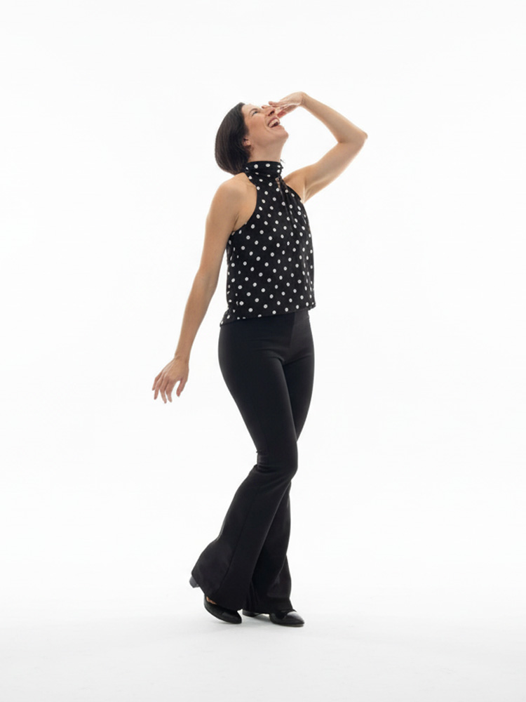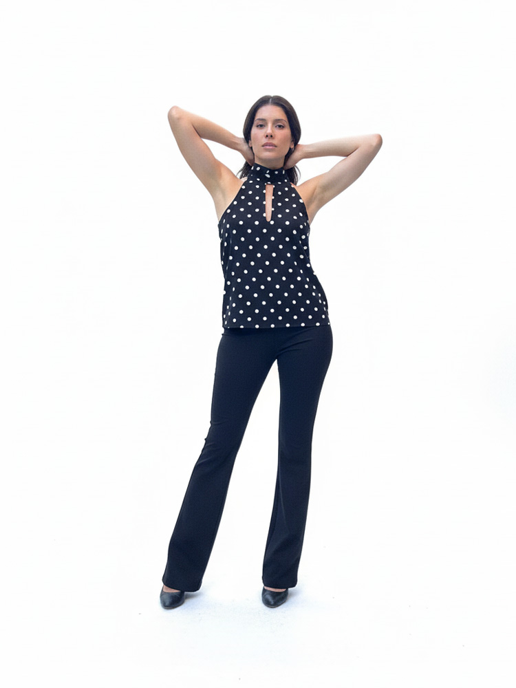 Top halter negro de lunares blancos, muy femenino y con tejido muy vaporoso.