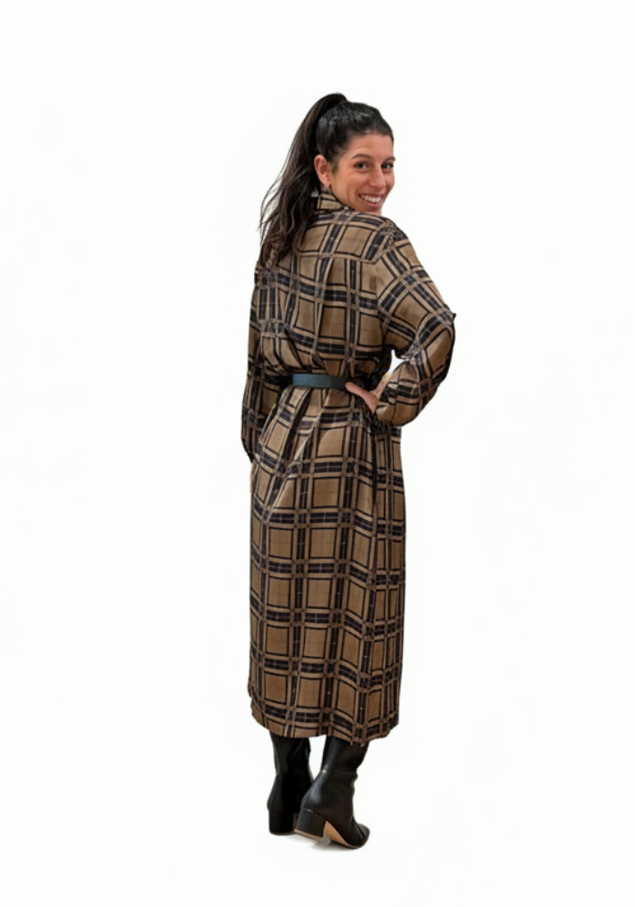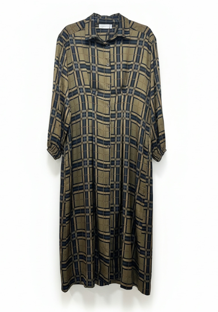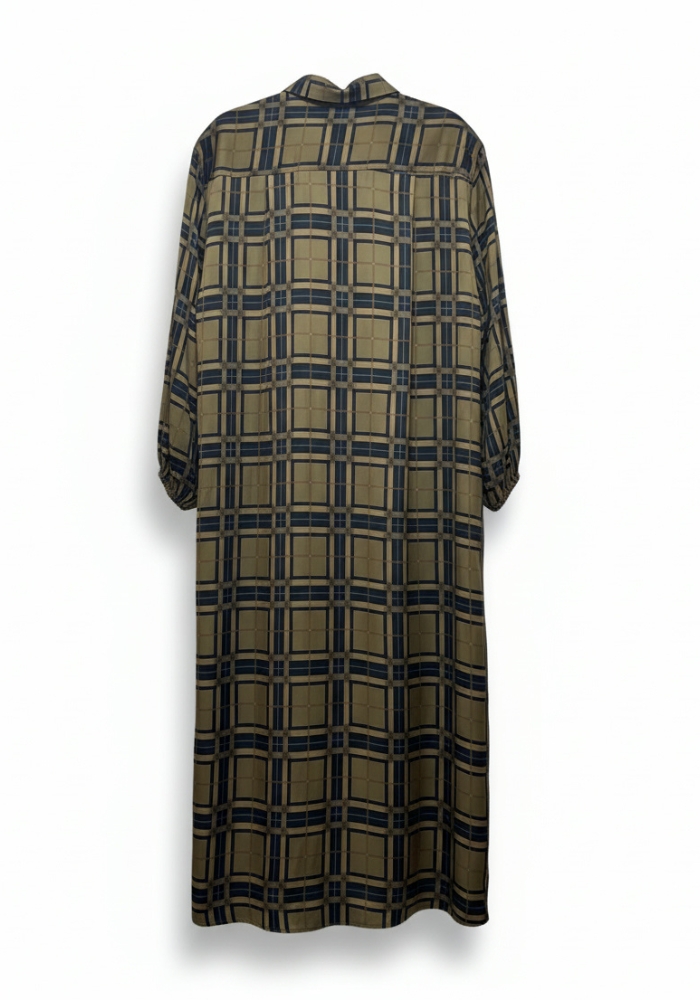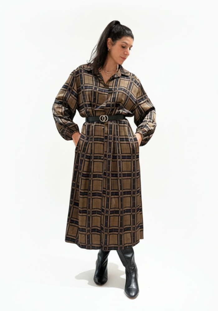 Vestido camisero negro con estampado de cuadros en tonos verdes. Las pinzas delanteras y bolsillos laterales aportan estructura y una silueta más favorecedora sin perder comodidad.