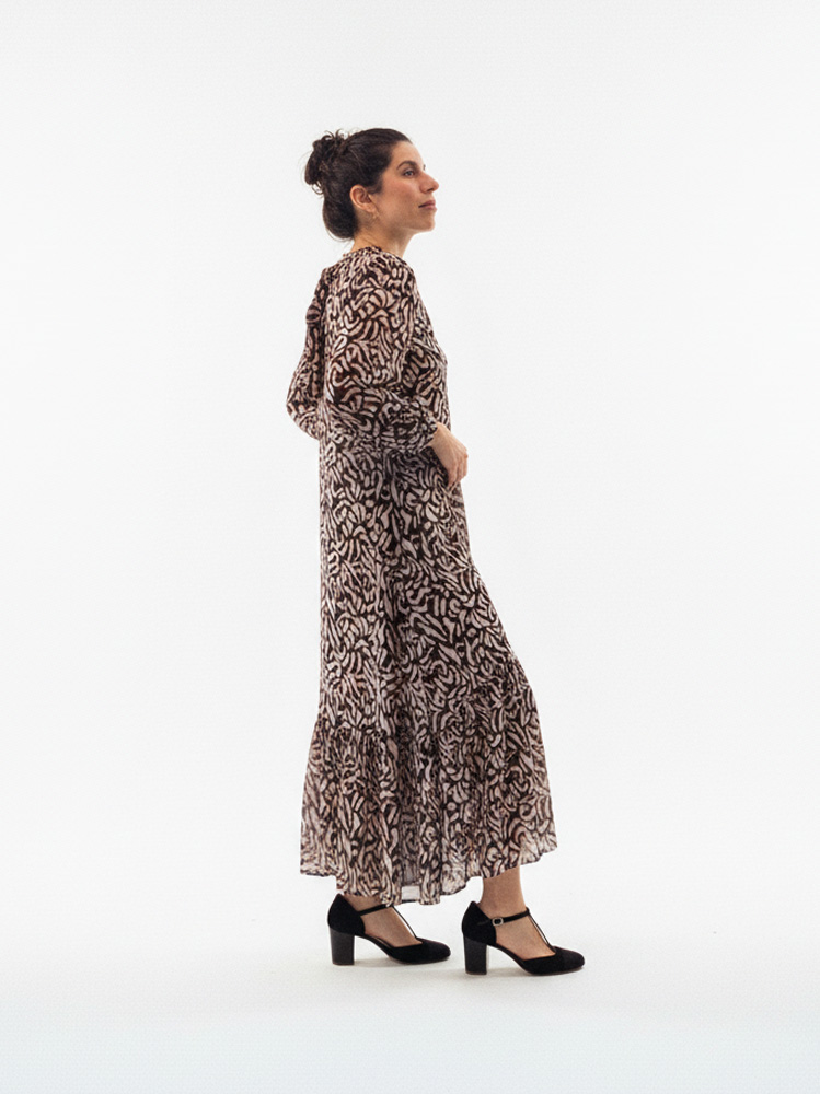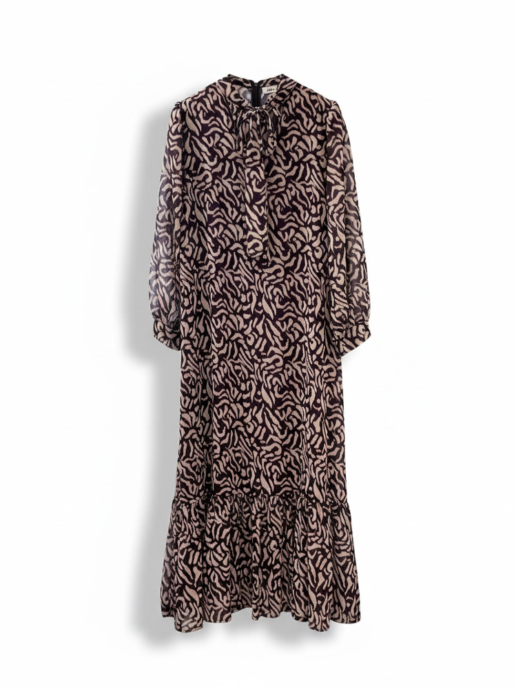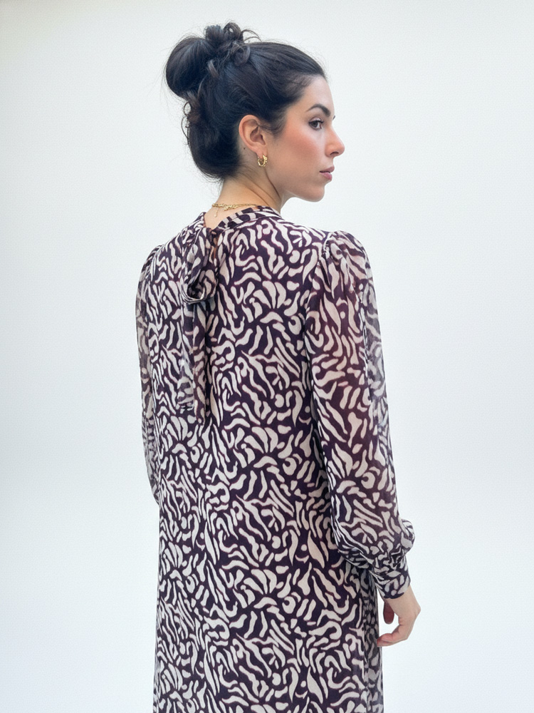Vestido estampado en tonos vino y blanco roto, con lazo en la parte trasera del cuello.